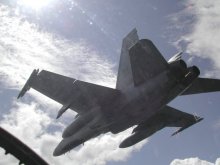 After consulting with the other jet we set up to begin our mission. We started off with some ‘guns weave’ manoeuvres again. After that, we set up to do some fantastic ‘loopers’ and ‘rollers’. These terms simply describe the manoeuvres the jets do on some head-to-head engagements. A great deal of the time was spent at about 4.5 to 6 g’s and in a vertical heading. The loopers would have us basically looping in the sky at each other. Trying to gain the advantage on each other was the order of the day. We would spend minutes at a time heading straight down only to pull into the vertical and head straight up. We hardly did any of this mission on the straight and level. Again I was really struck by the awesome beauty of seeing the other jet so close and skidding sideways across the skies. These BFM trips are the best. I’m sure all high performance fighters have this same characteristic, but there is something that really stands out during a Hornet flight. During hard manoeuvring and high g-loads, the sound is indescribable. The closest I can say is it’s sort of like a real hard ripping sound. You hear and feel this intense roaring ripping sound of the jet slicing through the air. It’s an incredible sound and feeling. It really brings home the whole reality that fighters are intoxicating.