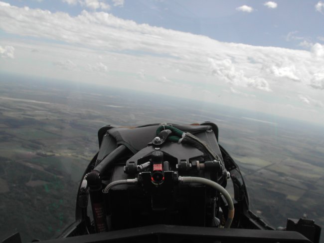 After about 40 minutes of BFM, ‘bingo’ was called. We set up the standard ‘battle damage check’ and then started back for the Base. Our 2 ship performed a nice formation into the break over the Base. On final my pilot realized we had a bit of extra fuel we could burn. Performing a ‘touch-an-go’, we took-off again. Once wheels and flaps were up, the pilot skimmed the earth to the end of the runway limits. He then pulled into a nice 4.5 g vertical and cranked us off to the right. We went around and did another touch-an-go. This time we headed off a bit further. We flew about 4 or 5 miles away from the Base. The pilot then gave me control of the jet. He instructed me to put in full afterburner and execute a 4 g right hand turn. After lighting the burners, I pulled to the right and pulled back on the stick. I was at about 2 g’s when the pilot came back on the radio and said “Come on ya pussy, pull 4 g’s!!” So at that, I pulled the stick much harder. After executing a 5.5 g turn and rolling back out into straight flight the pilot took control back. The next radio call was, “Good job, you pulled 5.5 g’s instead of 4 g’s….I guess calling you a pussy was enough to egg you on!!”
